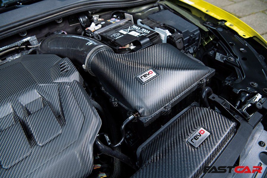 KW Clubsport V4 coilovers, thicker H&R anti-roll bars and Racingline control arms offer a visually impactful reduction in ride height and – more importantly – plenty of adjustability for road and track use. Subtle changes to the bodywork are finished off with a set of Maxton side skirts, and a splitter to press the front tyres a little more firmly into the tarmac at speed. Oh yeah, and ceramic paint protection to keep the yellow vivid on road and track.